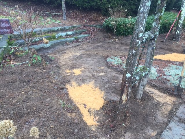 Despite the 1/2" of rain we received today, it was still a productive day. In front of the admin building, we are working on a little project to enhance this area and incorporate the old steps behind the 1st tee box. These steps are 1928 originals to HCC and they sadly became lost in a sea of pinestraw.