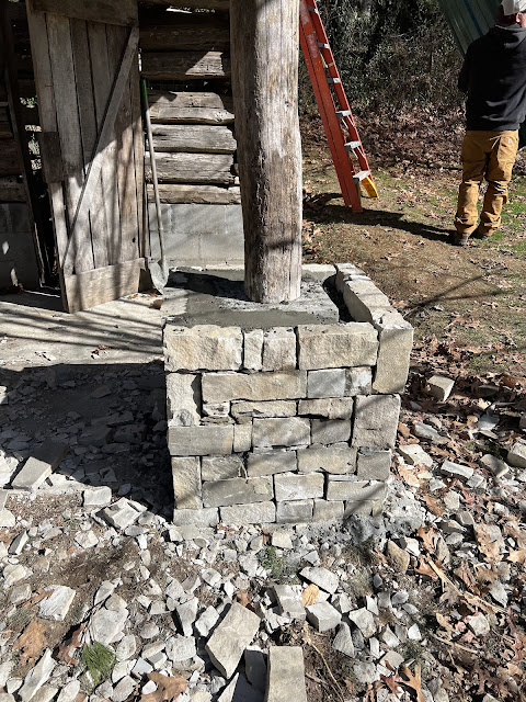 While Wayne and Billy are building a roof on the log cabin at the Farm, Lyn is busy building stone walls around the pillars and the foundation of the structure.