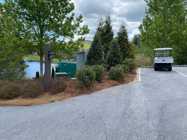 Above and below, you can see the work that our team did to screen the new Hudson House generator from view. The back side has a row of arborvitae to screen it from the lake side.